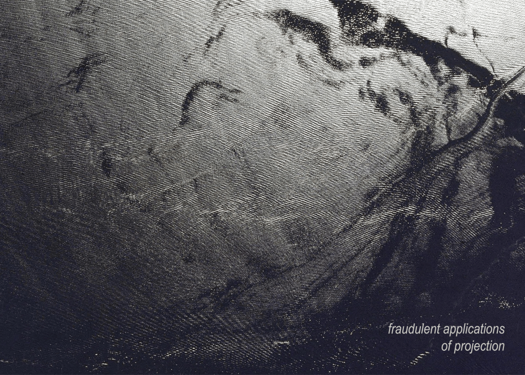 In mapping, projection refers to a broad set of transformations by which the curved surface of the Earth is represented in two-dimensional space. In alchemy, the same term denotes both the process and the physical reagent by which lesser metals could be transmuted into higher forms. Both usages derive from a spatial evocation: the act of projecting, of throwing forward; a dynamic action crossing between parallel but intersecting spaces. Mapping projection, however, invokes a rigid geometric framework (sometimes figurative, sometimes literal) that restrains the dynamic character of the object it represents. These practices order space, establishing mathematical principles and social procedures by which our protean world can be made static and fungible, in the process excising the errant, uncertain, and unknown. But, despite these efforts, everyday life is still unpredictable; meaning remains fugitive, and the substance of our world continues in its endless process of transformation, throwing us continually forward into the new. Fraudulent Applications of Projection features works that interrogate the range of visual tools and material practices that situate an individual in space, anchor them to a landscape, and orient them within the material world. The exhibition explores the tension between static, rectilinear representations of space (maps, photographs, satellite images) and the messier, disordered continuum of experience that characterizes daily life (fragments, impressions, material traces). Spanning disparate scales and incorporating multiple media—part panorama, part kaleidoscope—Fraudulent Applications of Projection invites viewers into a playground of cartographic abstractions, through which a vibrant, if sometimes fractious and fictitious, world can be glimpsed.